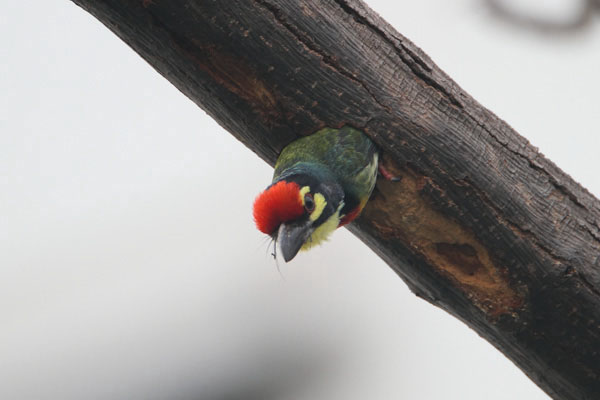 Anyway back to the birding. Two streets away from the hotel I found a small green space and local park. For such a crowded space Bangkok really knows how to look after their parks, this park was a no-smoking park which is just fantastic, now if they could just do something about the smog. Squeezed in amongst the high rise aprtment blocks the park called Suan Sant Phap was a cracking little green oasis. An amazing number of species here too for being in the middle of an Urban Jungle. First on the list were the ubiquitous Tree Sparrow. A lot paler and a little dowdier than the handsome birds we get here in the UK but so many more of them. As soon as I entered the park a Black-naped Oriole flew up from feeding on the grass and perched up in a Eucalyptus tree, however it did not stay there. This was to be the first in a long line of new life birds for my Thailand trip. I had only previously seen Black-naped Oriole in a cage in a market in the town of Ubud in Bali. That market in Bali really was not a nice place to be as I also found Orange-headed Thrush in cages too. You can imagine it was really satisfying to find my first wild Black-naped Oriole. Further into the park I found Eastern Crowned Warbler, Pied Fantail, Oriental Magpie Robin and Copprsmith Barbet. The Barbet was difficult to find at first but he did help by continuing to belt out distinctive Tonk call. When I finally did find the Barbet it showed me where it was nesting. A hollowed branch over a busy footpath turned out to be this birds home. I stayed a while wanting to get images of the bird as it exited the nest. I was to become a bird of an attraction in this busy community park. I must have looked a little strange pointing my 500mm lens up into the trees. In no time at all I found myself having to explain to some of the local walkers and joggers just what I was doing. This is where Live View on the 7D comes in handy and I just showed them the bird on the back of the camera.